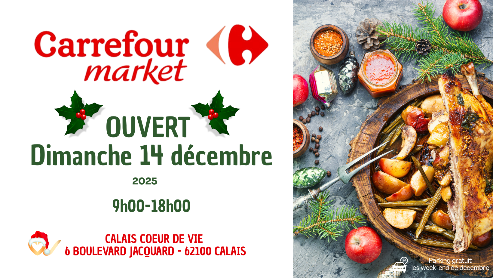L'équipe Carrefour Market Calais Coeur de Vie vous accueille du lundi au samedi de 8 h00 à 20h00.